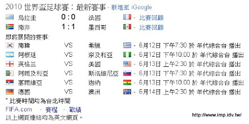 2010 世界盃足球賽:最新賽事更新(點我) - 新增至 iGoogle